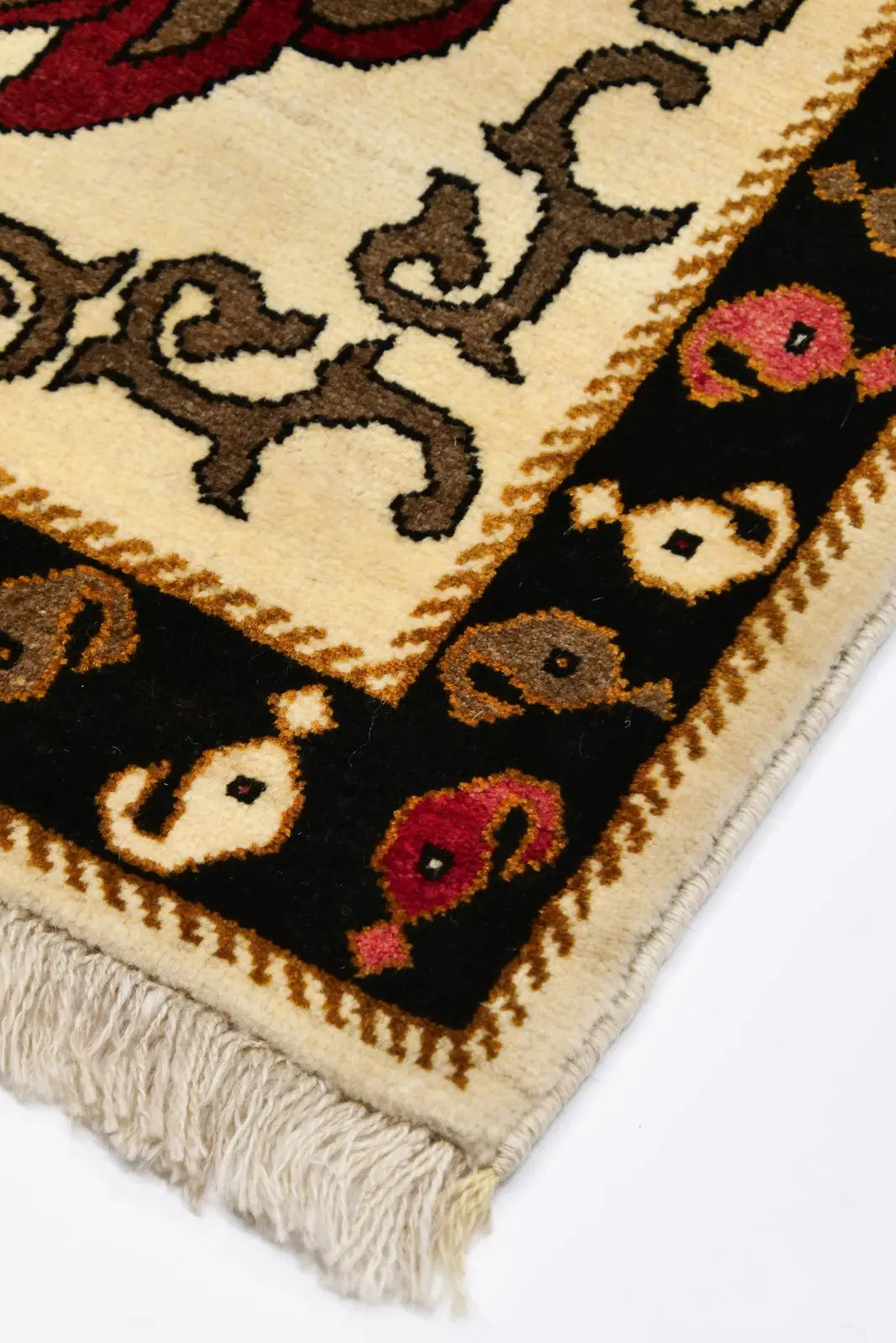 シーラーズ産の手織りギャッベ。ナチュラルウールの生成り色に赤とブラウンのボテ文様が並ぶデザイン