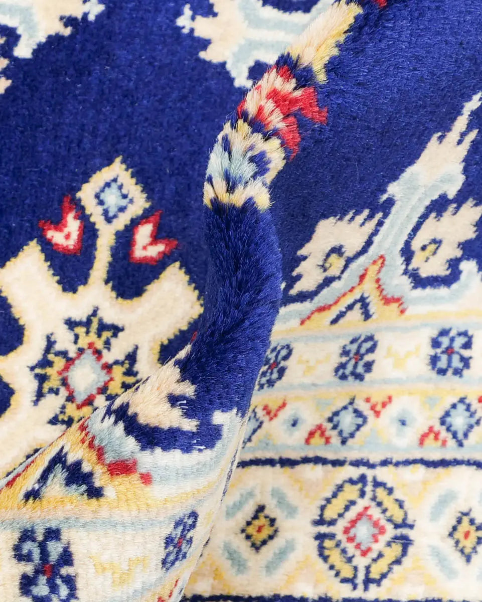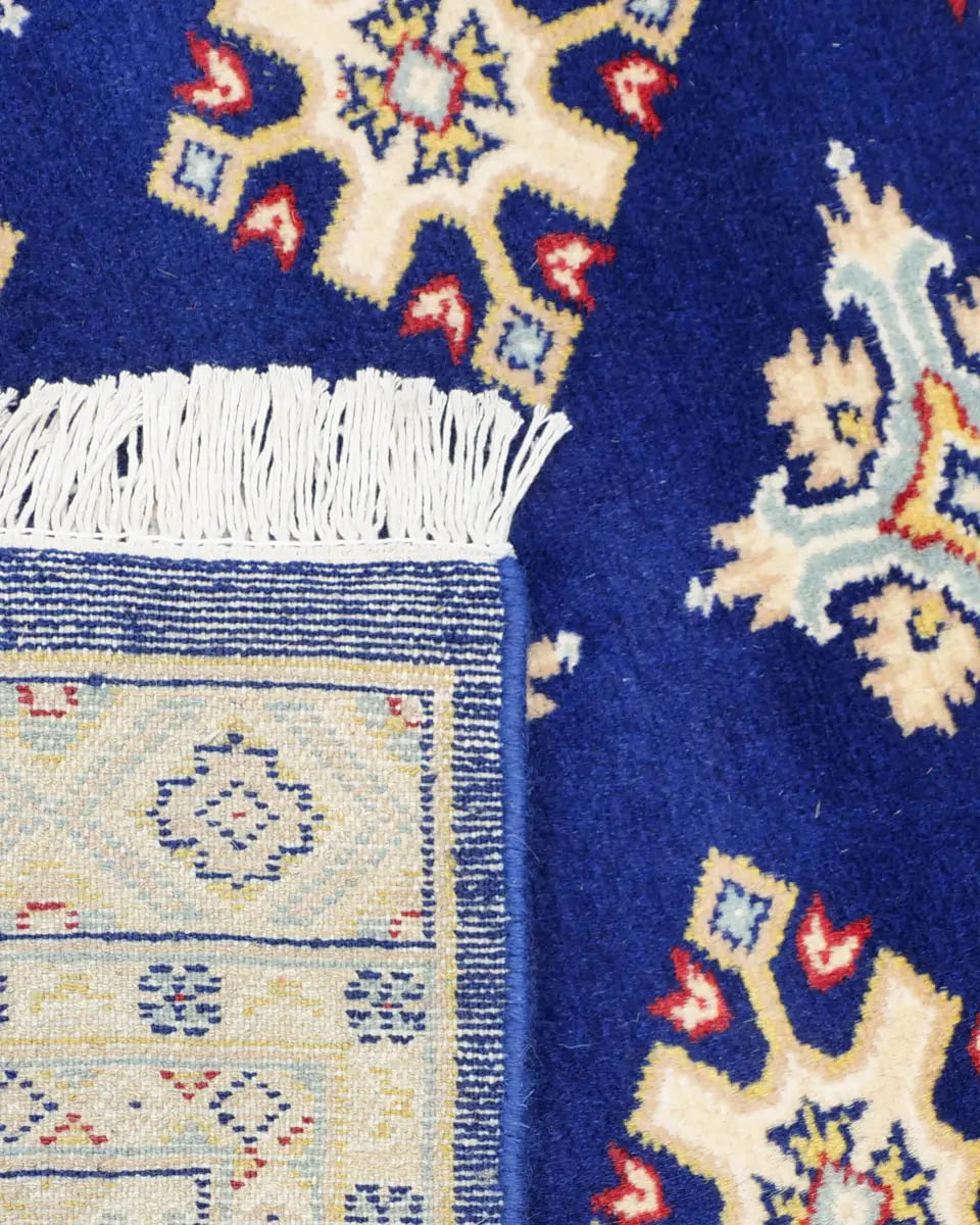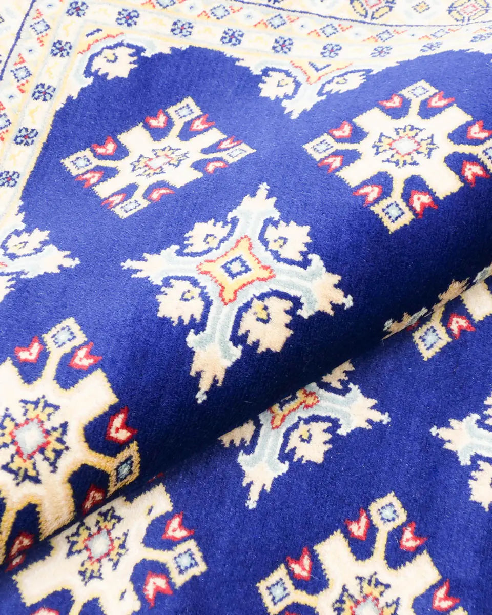 ネイビー地に二種類のひし形模様が規則的に並んだラホール産手織りパキスタン絨毯