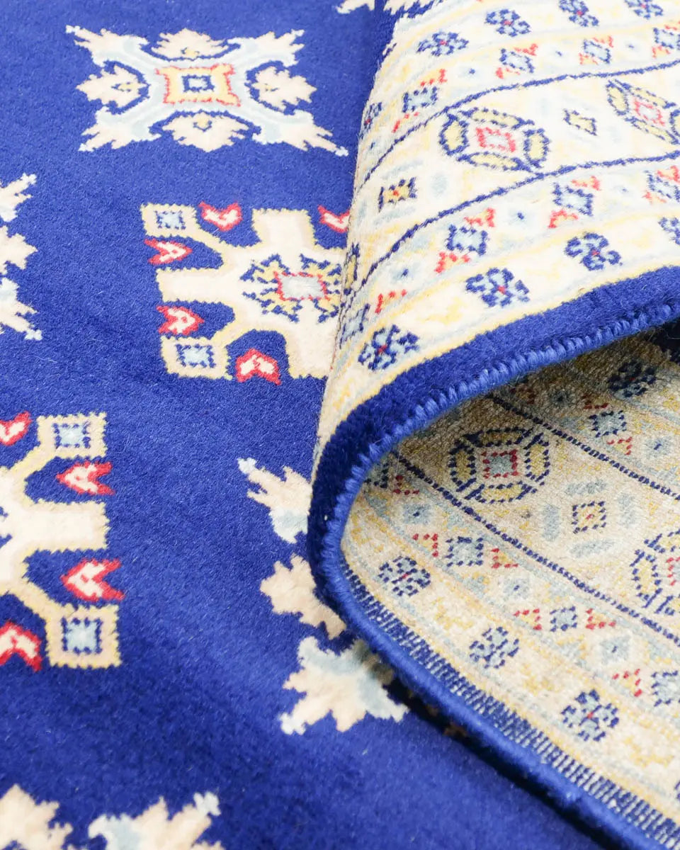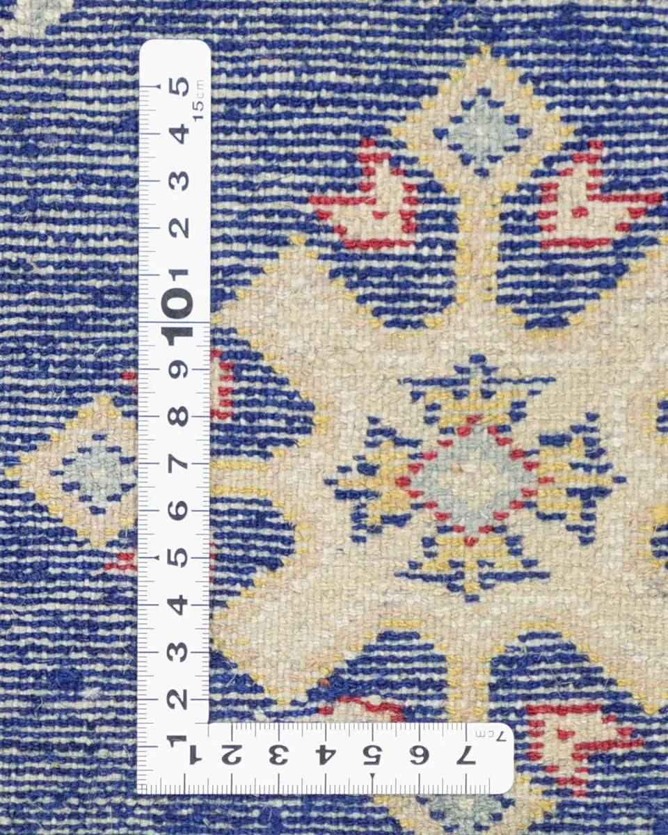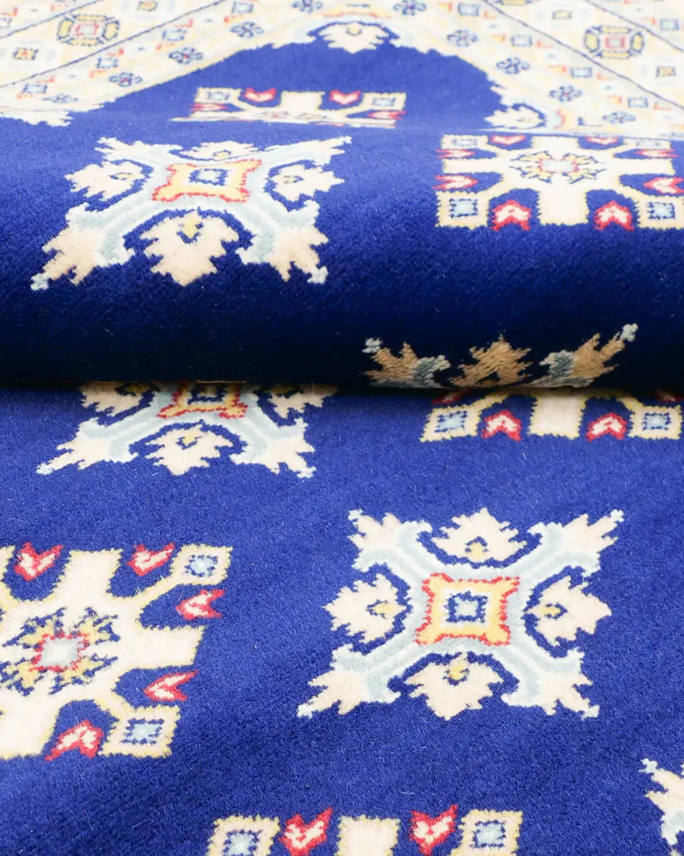 ネイビー地に二種類のひし形模様が規則的に並んだラホール産手織りパキスタン絨毯