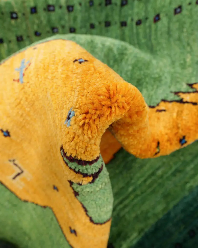 这是波斯设拉子地区手工编织的 Lion Gabbeh 地毯。这是一件独特的作品,以绿色为底色,上面有一只狮子。
