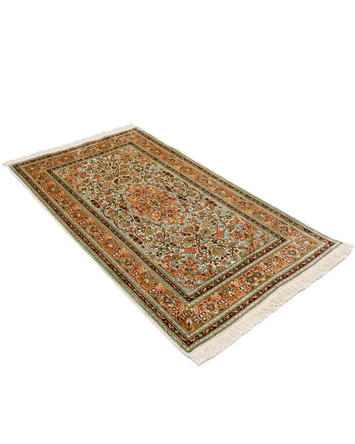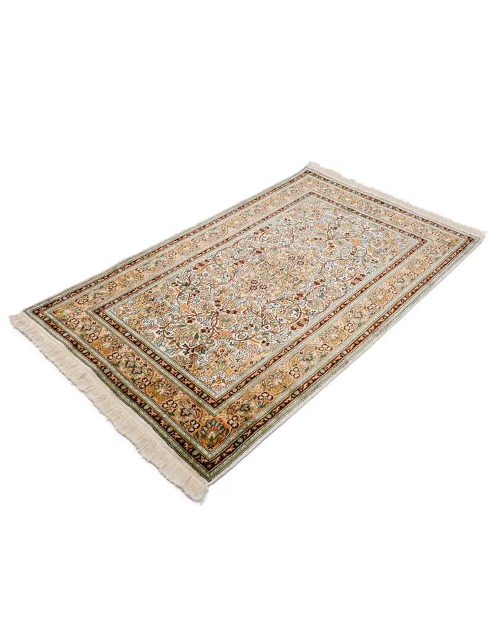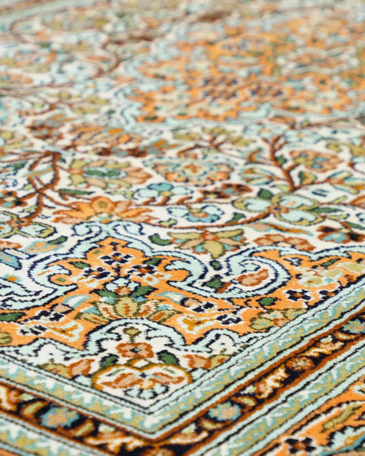 这是一条手工编织的丝绸地毯,产自横跨印度北部和巴基斯坦东北部的克什米尔地区。