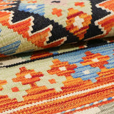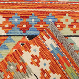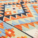 这是阿富汗手工编织的基里姆毯。该作品具有大胆的色彩和几何图案,很容易融入您的房间作为装饰。