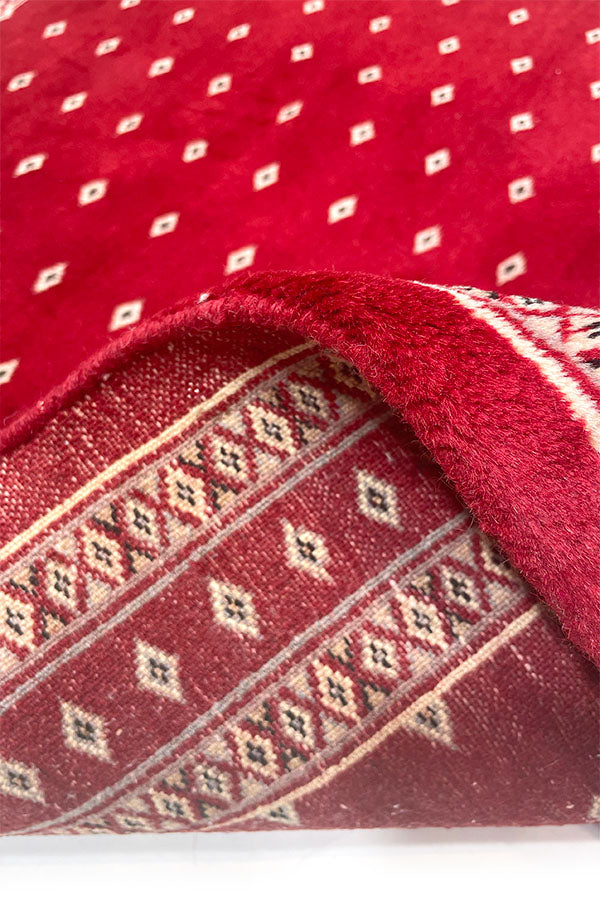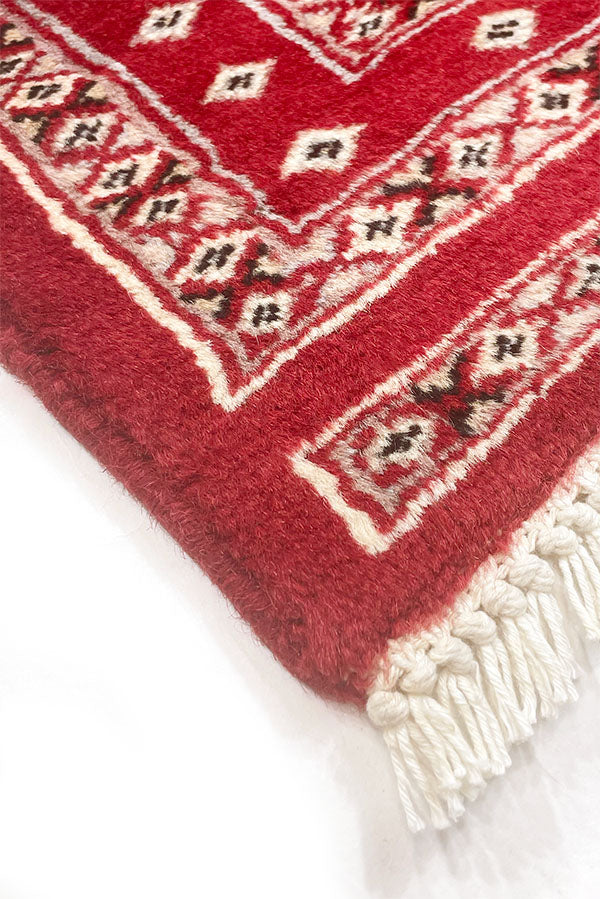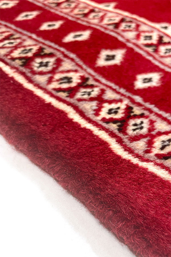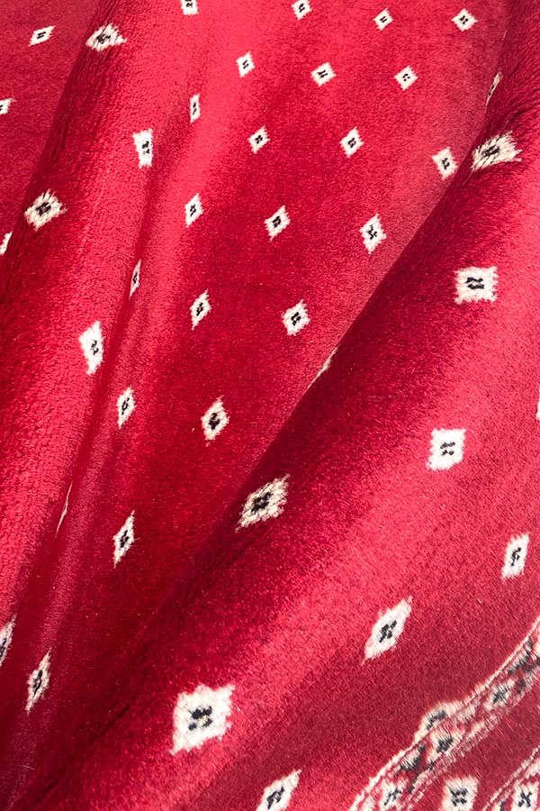 底色为鲜红色,巴基斯坦地毯独有的几何图案被精巧地编织在织物上。