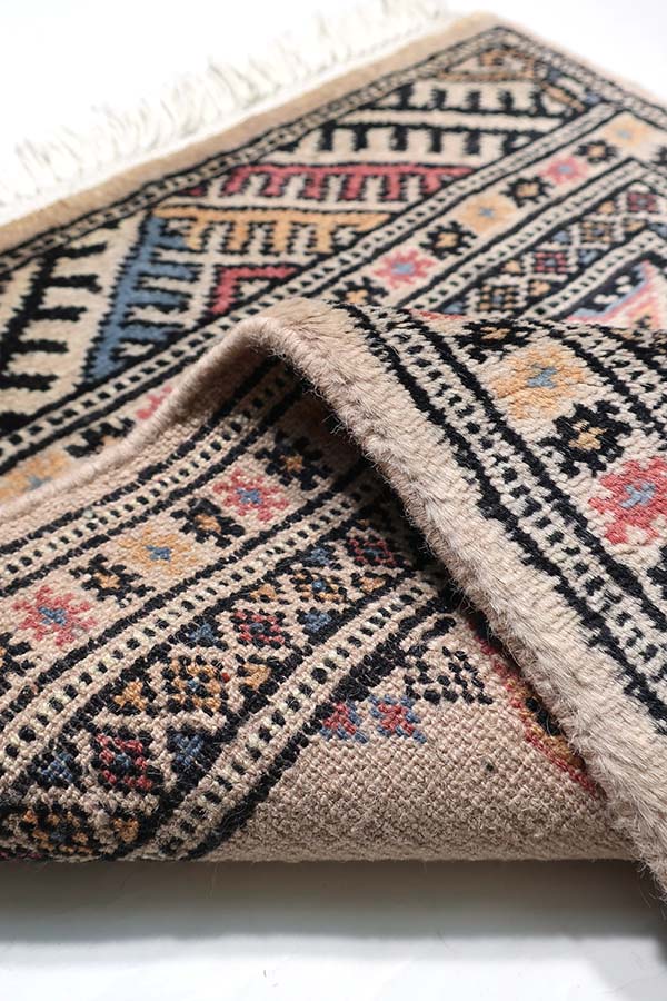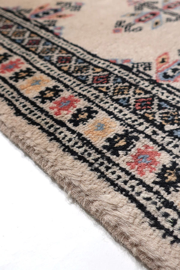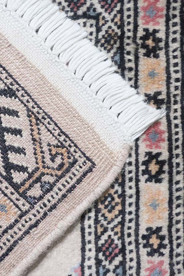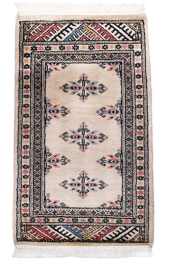 底色是浅米色。这是一个美丽的设计,具有巴基斯坦地毯独有的几何图案。