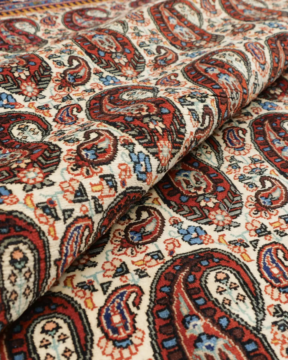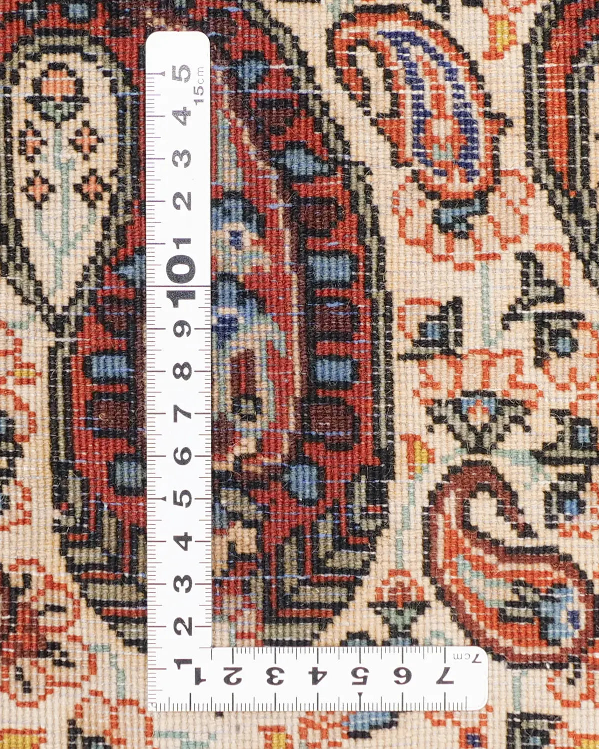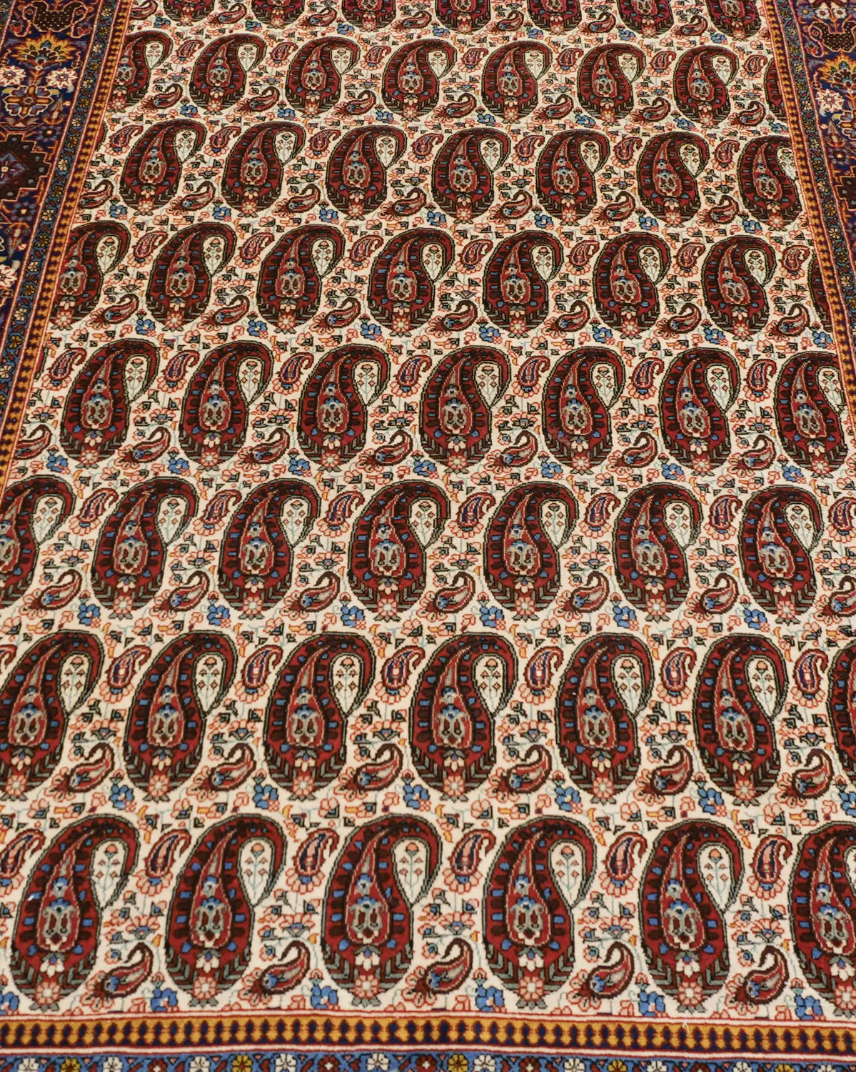 フィールドには、糸杉や松ぼっくりを図案化したボテ文様が8段に整然と並びます。ボテは古来より長寿や力を象徴し、サファヴィー朝の王冠にも取り入れられた伝統的な意匠です。大きなボテの周囲には、小さなボテが配されています。