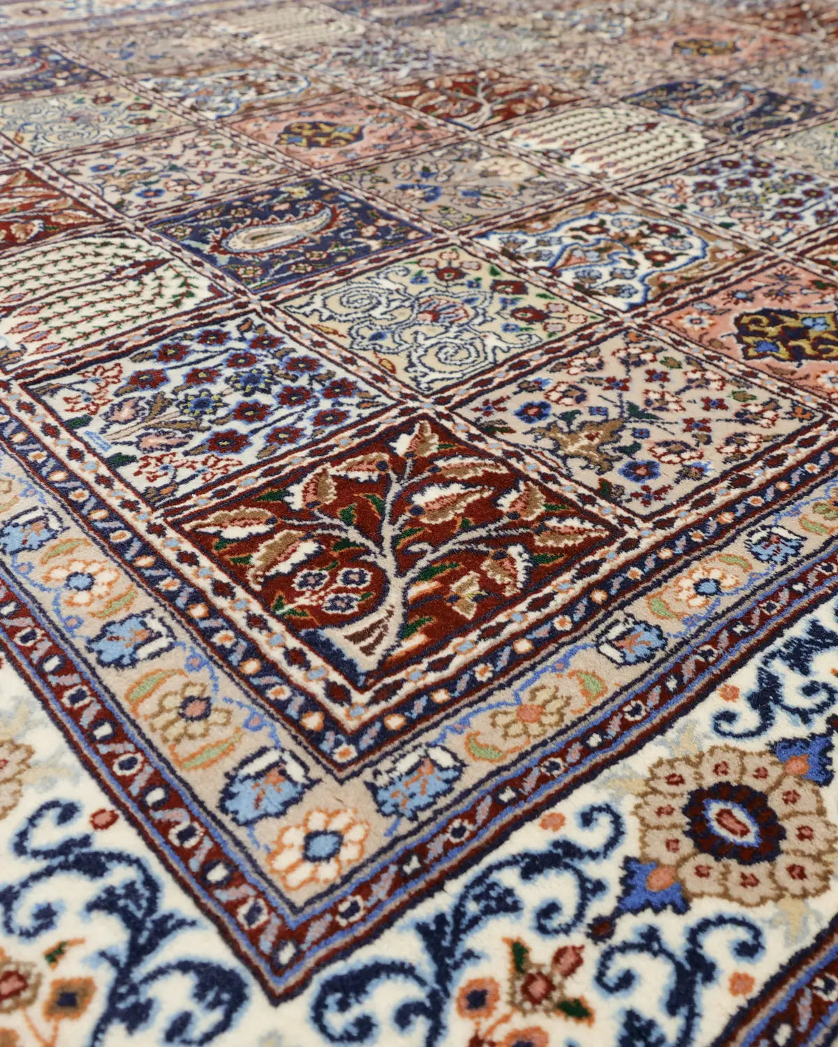 それぞれの区画には、生命の木、唐草文様、花瓶、ペイズリー(ボテ)などのモチーフが織り込まれており、「庭園模様」とも呼ばれます。