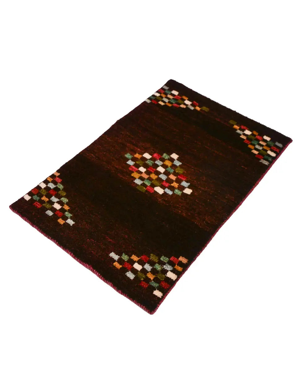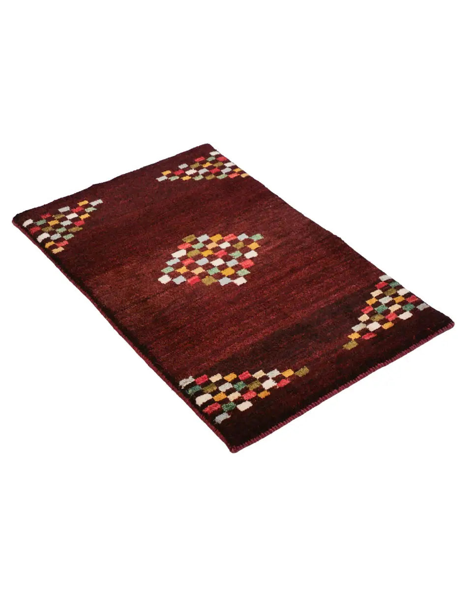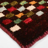 这款来自波斯设拉子的手工编织 gabbeh 具有深酒红色底色,并以彩色方形图案为点缀。