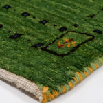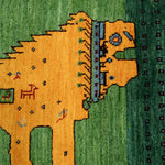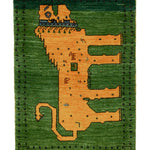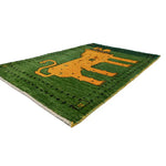 这是波斯设拉子地区手工编织的 Lion Gabbeh 地毯。这是一件独特的作品,以绿色为底色,上面有一只狮子。
