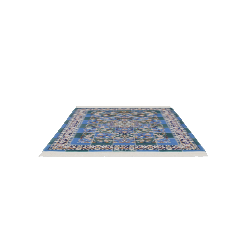 ブルーとエメラルドグリーンのタイル模様に、中央のメダリオンから放射状に広がるアラベスク(唐草)と花々の曲線が、均整のとれた構図で織り上げられています。