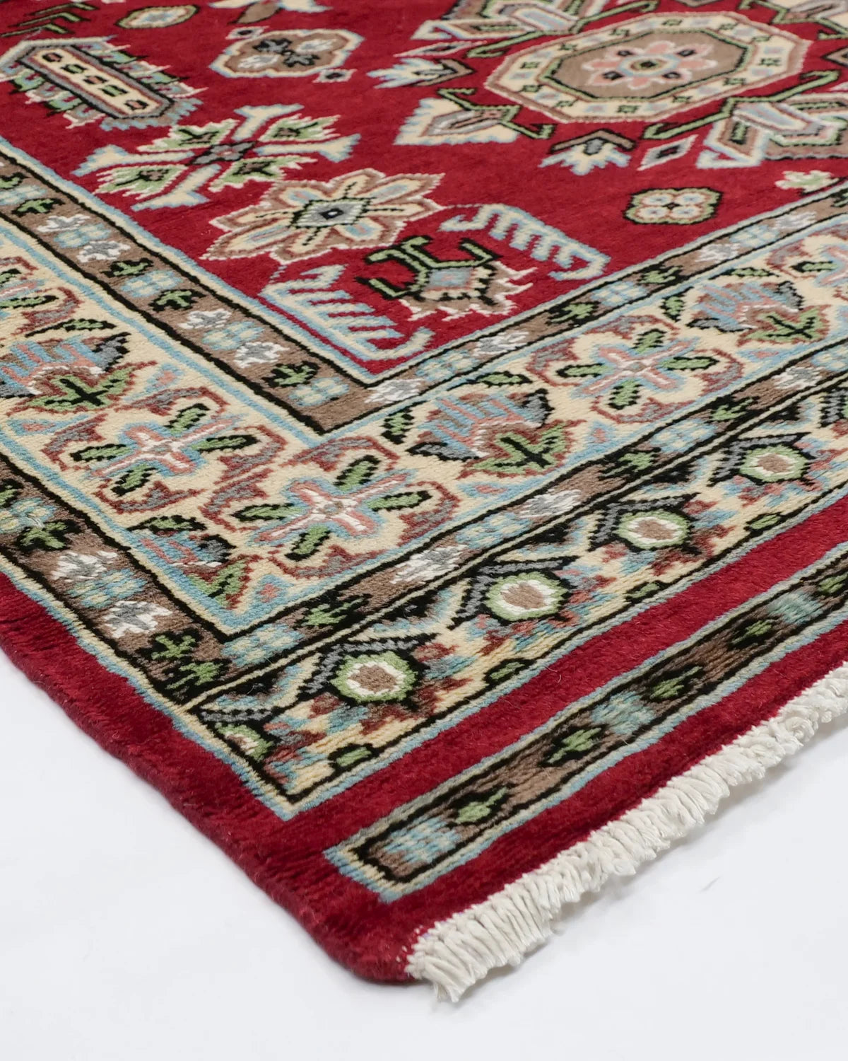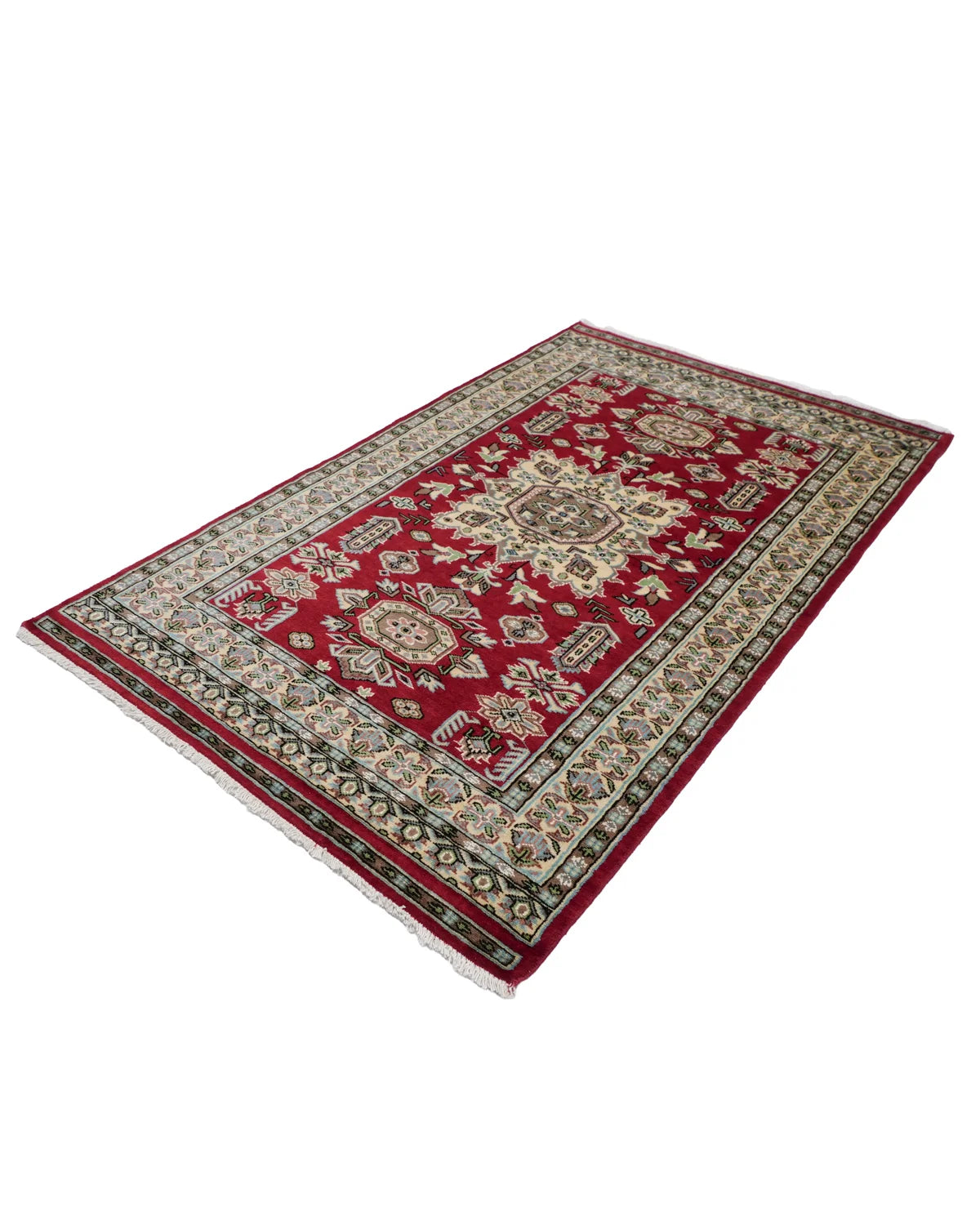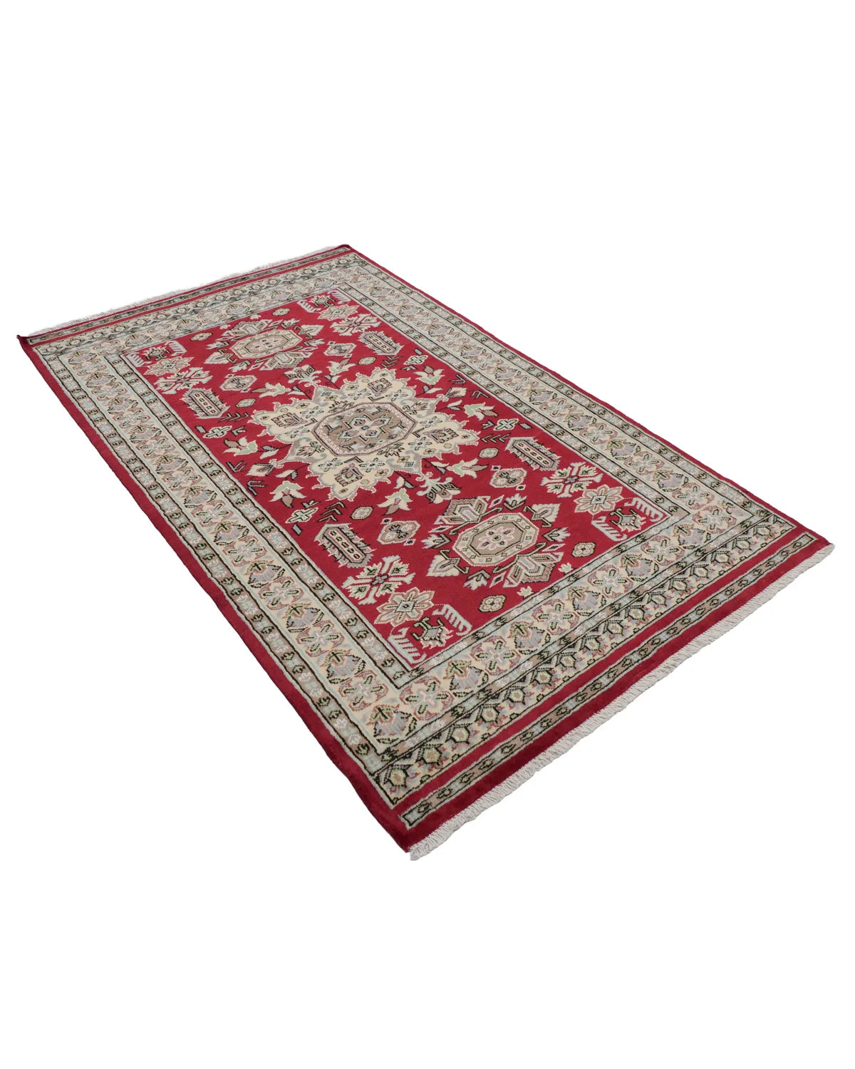 アイボリーの縁取りが映える、深紅のパキスタンウール絨毯
