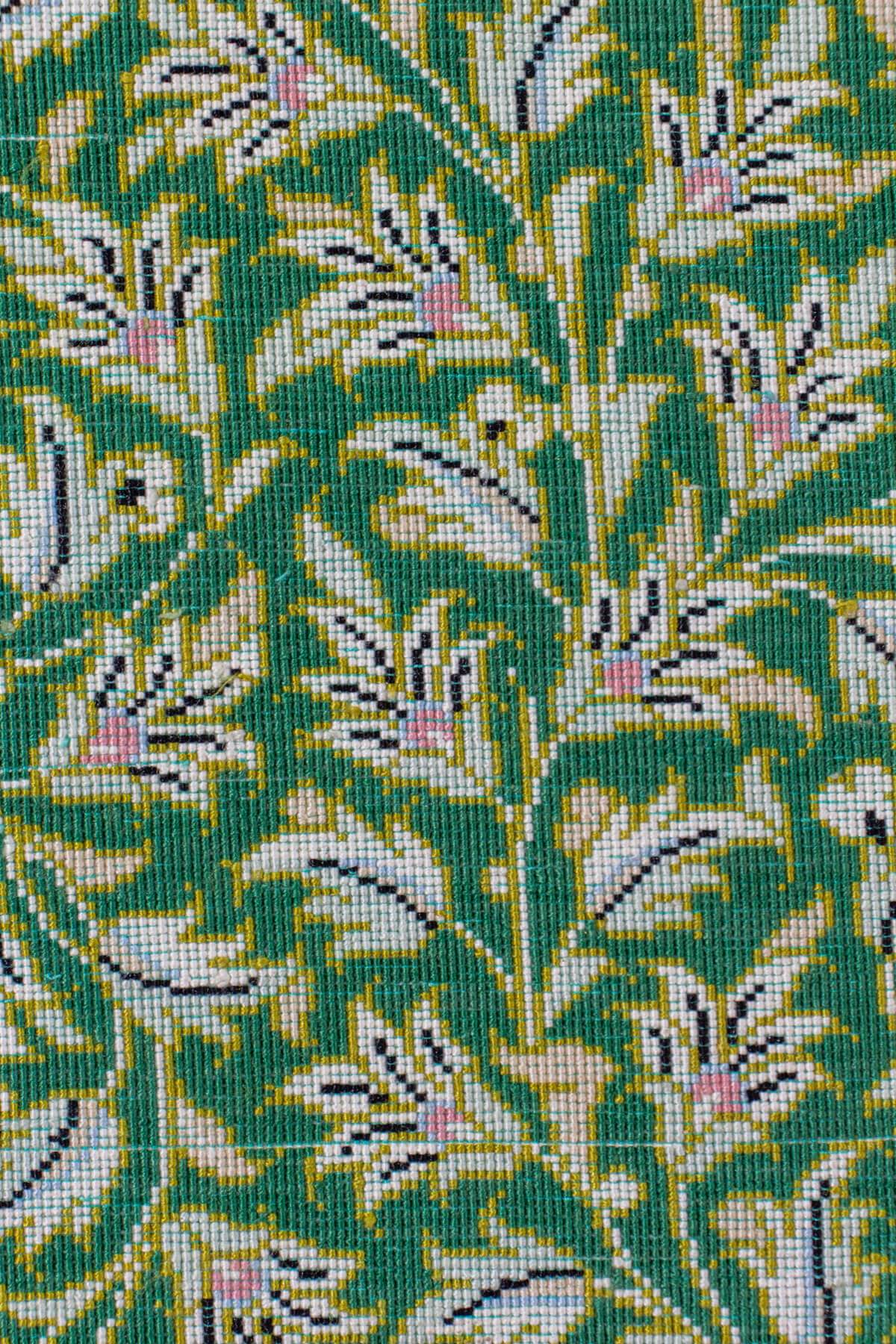 这种织物采用闪亮的丝线制成,并用天然颜料染色。在一厘米见方的面积内结有一百多根绒线,编织出精细的小花朵图案。